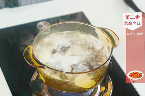 4.锅内放入适量清水烧开,放入山药、木耳煮1分钟后捞出;