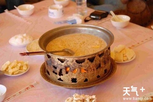 蒙古的朋友离不开茶,一日三餐均不能没有茶。他们喝得不是南方茶叶泡制的茶,而是奶茶。奶茶在蒙古语叫“乌古台措”。用布袋将茶叶捞出,将桶内茶水和鲜牛奶倒入锅沸煮,并用勺子反复扬晾,融后就可以饮用。要是是问蒙古人日常饮食中最看重的是什么?那得到的回答肯定是茶。蒙古民族热情好客,家里来了客人,放好桌子,桌子中央放上满满一大盘炒米,周围摆上盛在瓷盘里的黄油、奶豆腐、红糖、各种饽饽,接着献上热气腾腾的奶茶。奶茶的种类很多。