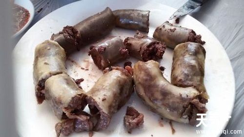 血肠制作的主要原料是羊小肠和羊血。羊血是通过蒙古掏心法杀羊后的产物,将盐、葱末、少量的水和面粉放入羊血中,调成血浆。再将羊肠用盐水洗净,灌入调好佐料的羊血,细线扎紧羊肠两头于水中煮熟。