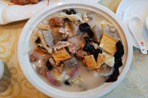 百年聚宾楼是吃河南安阳烩菜的好地方,这是一家老店了,在当地名气很大,不少人举办宴席或者是聚餐都会选择在这里。要吃本地菜来这里准没错,他家的菜品大多是豫菜,菜量很足,烩菜是其中比较受欢迎的菜品,几乎每一桌都会点一份,烩菜做的很地道,血糕凉粉都很好吃。