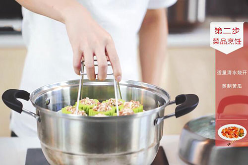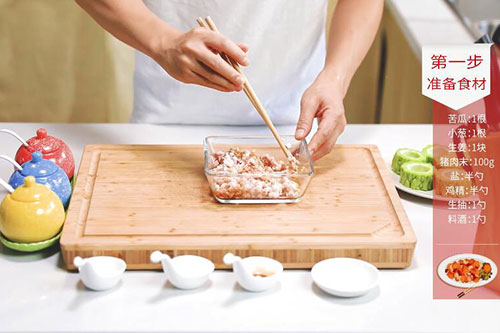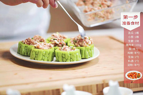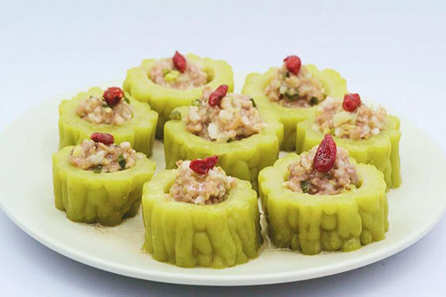 苦瓜酿肉是一道地道的湘菜,营养健康,苦瓜酿肉的做法简单,苦瓜切段,肉末加盐,鸡精等调匀,用小勺将肉末放进苦瓜段里面,蒸锅水烧开,放入苦瓜蒸10分钟,出锅放枸杞,淋麻油即可。