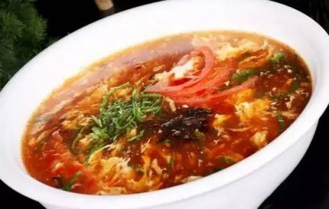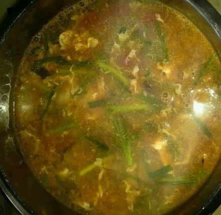 4、锅烧热加油入豆瓣酱炒香泛红,加入肉丝略炒至肉变白盛起。原锅中加2大杯水,放入姜丝,黑木耳丝,水煮沸后加豆腐丝,榨菜丝,调味汁和肉丝、再煮起时入番茄丝,并加水粉起糊,后加葱丝,滑入鸡蛋汁并轻轻搅拌使蛋汁成丝状即成。