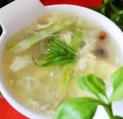 原料:鸡蛋2个,香菇5朵,韭菜50g,植物油15g,盐,味精适量,高汤500g