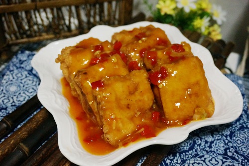 3、一面煎黄后,翻豆腐块,继续煎另一面,煎好后盛出;