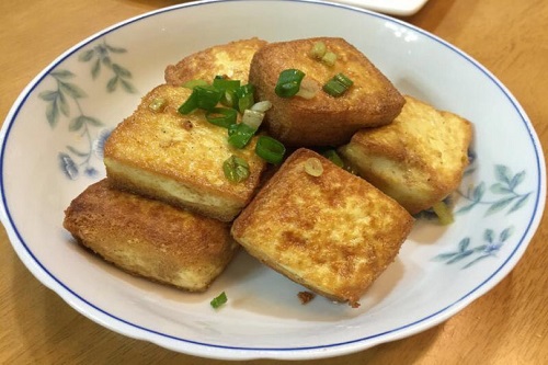 3、豆腐块晾干水分,锅中加油稍加热,放入豆腐小火煎,洒上少许椒盐;