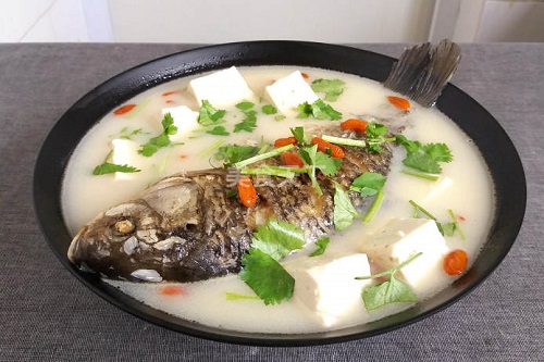 1、鲫鱼洗干净,宰杀好,控干水分,豆腐切成小块,姜切片,香葱打成结;
