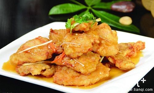 锅包肉是东北地区很有名的菜,采用的是猪里脊肉,肉片腌入味,裹炸浆,下锅炸至金黄色捞起,再下锅拌炒勾芡即成。
