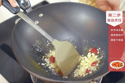 3.锅中放入适量油,油温烧至7成热,放入姜蒜末、干辣椒爆香;