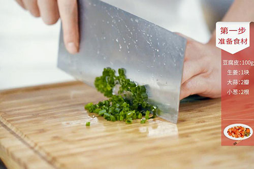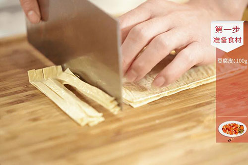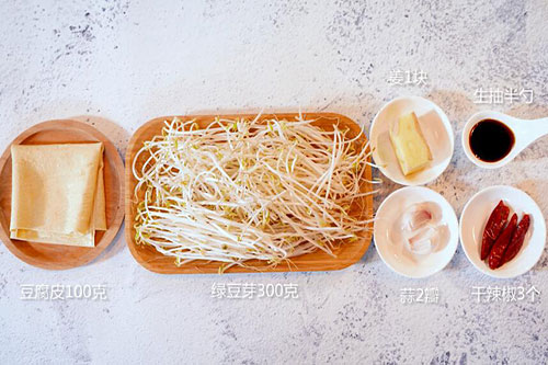 1.绿豆芽洗净,沥干水分。豆腐皮洗净切丝。姜1块切末,蒜2瓣切末;