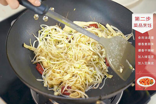 4.加入黄豆芽翻炒至断生,豆芽炒腐皮的做法 豆芽炒腐皮怎么做加入豆腐皮翻炒均匀;