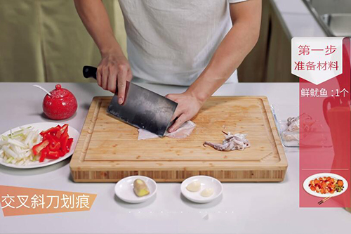 1.鲜鱿鱼洗净,在鱼身表面交叉斜刀划痕,注意底部不能切断,切成小块,放入盐半勺拌匀;