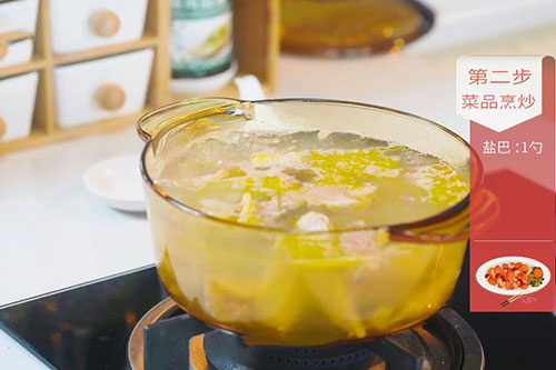 5.2小时后关火,放入盐2勺、鸡精1勺调匀即可。