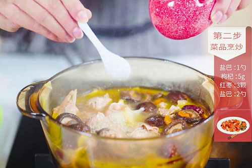 4.锅中放入姜片、香菇,鸡肉块、红枣3颗,枸杞5克,倒入适量清水烧开(水一次加足,这样炖出来的鸡汤更浓),转小火煲2小时;