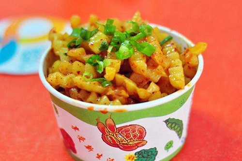 狼牙土豆算是一种很有当地风味的一种小吃,尤其是在学校门口,这种小吃是相当受欢迎的,狼牙土豆制作并不难,用土豆制作而成,现炸现卖,一般在街边摆一个小摊就可以了,狼牙土豆其实就是我们所知道的炸洋芋,拌上调味料,香味扑鼻。