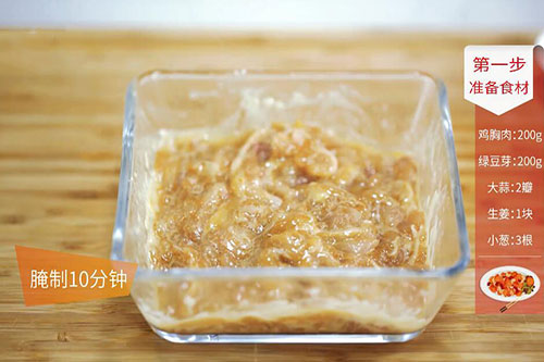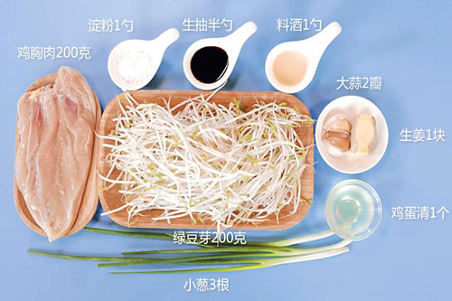 1.绿豆芽洗净沥干、鸡胸肉洗净,切片后切成细丝,加入生抽半勺、料酒1勺、鸡蛋清1个、淀粉1勺拌匀后腌制10分钟,小葱3根切段,姜1块切末,蒜2瓣切末;