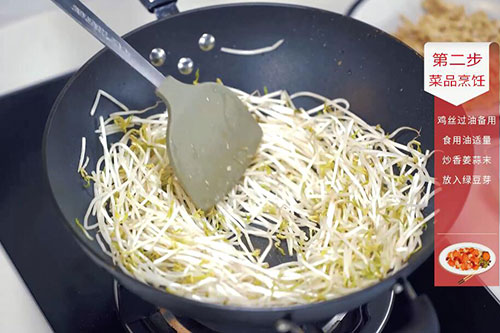 3.锅中留底油,放入姜蒜末炒香,放入绿豆芽大火炒至断生;