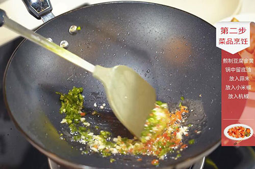 3.锅中留底油,放入小米椒、杭椒碎、蒜末炒香;