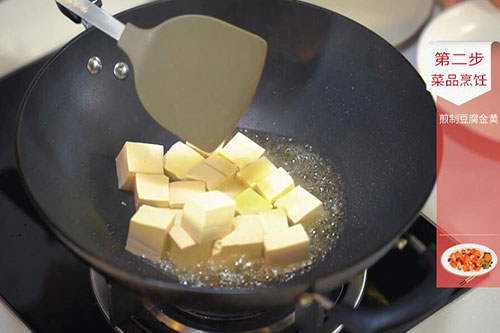 2.锅中放入适量油,油温烧至7成热,放入豆腐小火慢煎,至表面金黄酥脆后捞出待用;