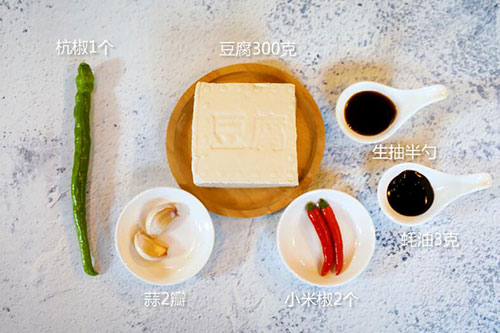 豆腐300克,小米椒2个,杭椒1个;