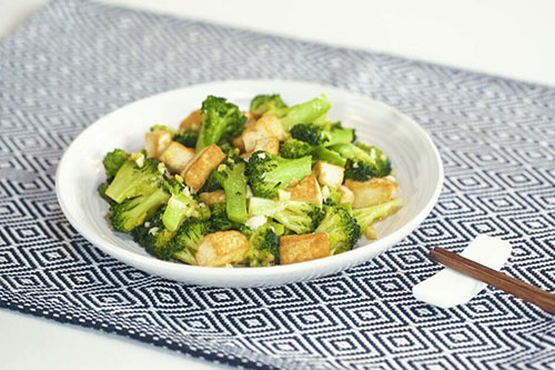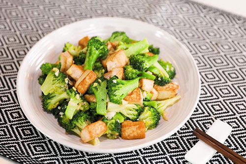 西兰花洗净切小朵,豆腐切小块,姜蒜切末;锅中加水烧开,放菜花焯水1分钟,捞出;油锅烧至6成热,放豆腐小火煎至焦黄,盛出备用;留底油,放姜蒜末炒香,放西兰花、豆腐翻炒,加盐、鸡精、胡椒粉炒匀,加水淀粉勾芡即可。