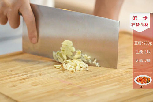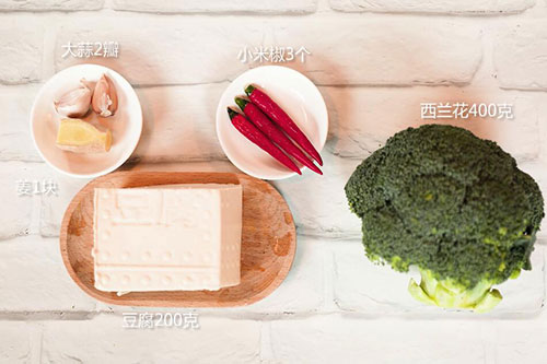 1.西兰花洗净,切小朵,豆腐切小块,姜1块切末,蒜2瓣切末;