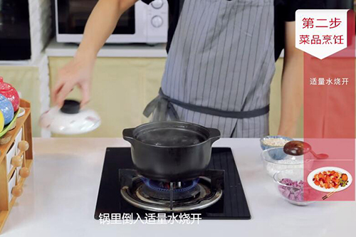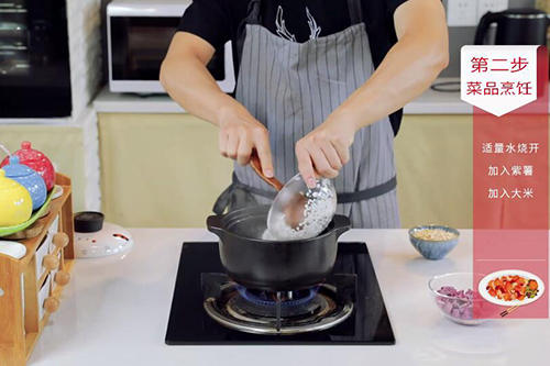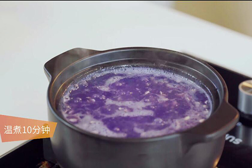 4.将紫薯和大米放入后盖上锅盖,用大火煮开后换中火;