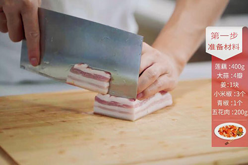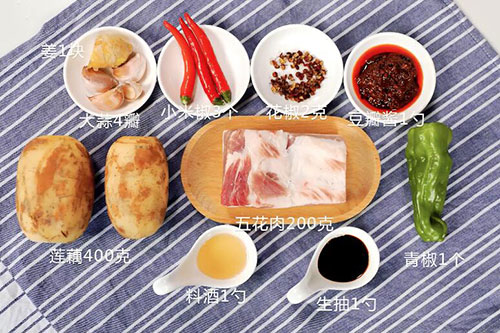 莲藕400克,五花肉200克,青椒1个,小米椒3个;