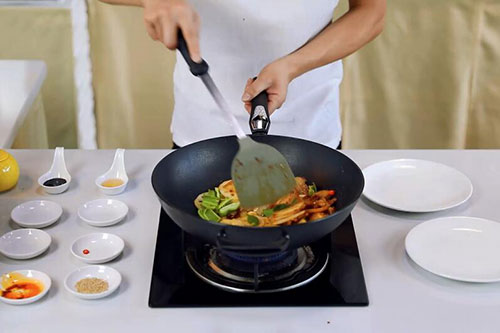 4.放入生抽1勺、料酒1勺翻炒半分钟,调入盐半勺、鸡精半勺、白糖半勺、白芝麻3克即可。