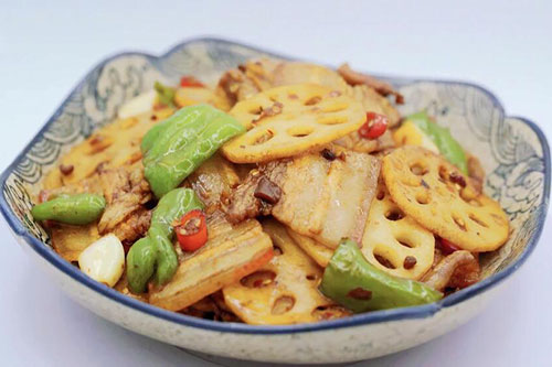 香锅莲藕五花肉的做法 香锅莲藕五花肉怎么做好吃五花肉的做法很多,今天介绍的是香锅莲藕五花肉的做法,莲藕切片,青椒,小米椒等食材切好,油锅烧至5成热,放五花肉煸炒,放豆瓣酱炒出红油,放姜,花椒等炒匀,调入盐,鸡精,白糖等拌匀出锅即可。