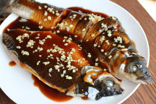 6、卤汁淋少许熟油,然后出锅浇在鱼身上,最后撒上极细的姜末就可以了。
