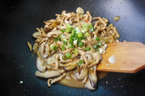 5.倒入腌制好的肉丝,炒至变色盛出;