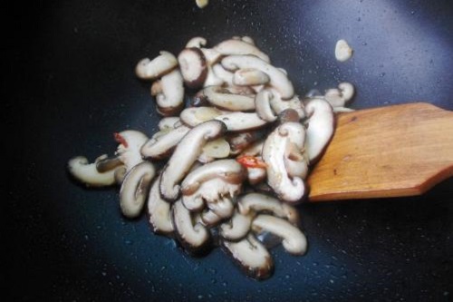 7.倒入香菇丝,快速翻炒,倒尖椒丝,炒匀