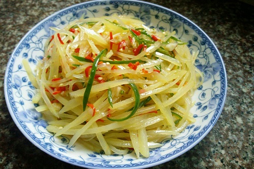 5、往土豆丝里放入香油,蒜末,盐,味精,喜欢辣的可以放点辣椒丝,拌匀即可。