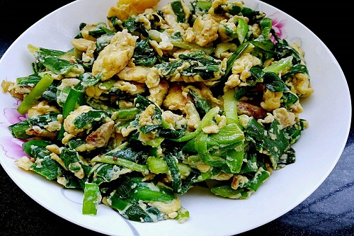 4、韭菜炒至七八成熟时,倒进鸡蛋,煎至熟;