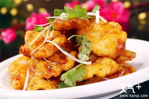 4、锅包肉是一道东北风味菜,即将猪里脊肉切片腌入味,裹上炸浆下锅炸至金黄色捞起,再下锅拌炒勾芡即成。成菜色泽金黄,外酥里嫩,酸甜可口,加上吃多不油腻的特点,很适合夏天食用以达到开胃增食欲的目的。
