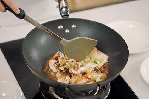 6.锅中留底油,放入蒜末爆香,加入鱼块、青尖椒圈、小米椒圈、大葱粒翻炒均匀;