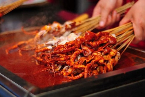 火爆鱿鱼大家可能不是很清楚,这事二道街夜市最接地气的一种小吃,类似于烧烤,很有当地风味,当地人用竹签把鱿鱼穿起来,然后将鱿鱼放进锅里面炸一炸,炸好后,拿出来沾上特制的辣椒酱调料,这种鱿鱼的做法比较简单,但是味道却很好,吃起来脆嫩鲜香,麻辣可口。