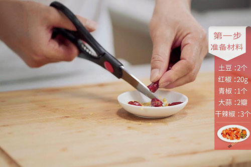 干辣椒3个,蒜2瓣,花椒2克,盐半勺,鸡精半勺,醋1勺;