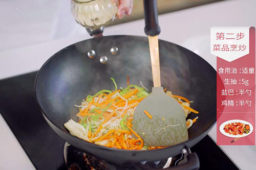 6.断生后放入青椒丝、调入盐半勺、鸡精半勺炒匀即可。
