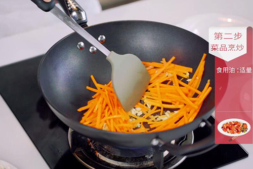 4.锅中放入适量油,油温烧至6成热,放入姜蒜末炒香,放入胡萝卜丝,炒至断生;