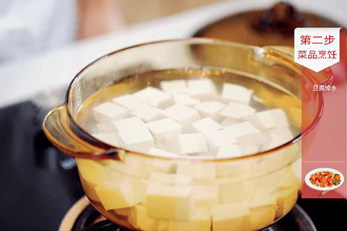 2.锅内倒入适量清水烧开,放入豆腐、放入盐1勺焯水1分钟,捞出沥干水分;