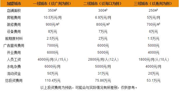 作为一家知名的主题餐厅,加盟荷美泰至少需要53.1万元以上,一线万元左右,二线城市(以海口为例)则在75万左右,受地域因素影响较大。