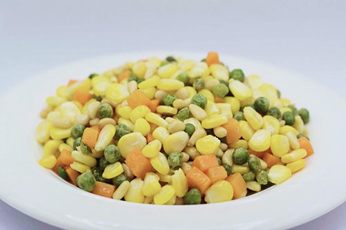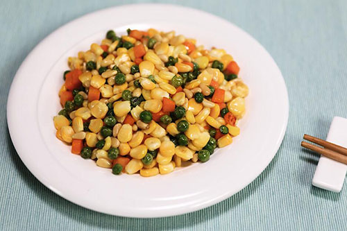 胡萝卜洗净切丁,青豌豆、玉米粒洗净待用;油锅烧至6成热,放胡萝卜丁、豌豆粒小火翻炒3分钟,再放玉米粒继续翻炒,最后放松子、盐和鸡精炒匀即可。