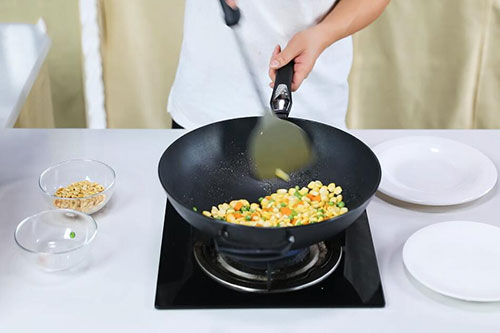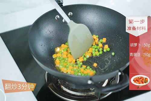 2.锅中放入适量油,松子玉米的做法 家常松子玉米怎么做油温烧至6成热,放入胡萝卜丁、豌豆粒小火翻炒3分钟;