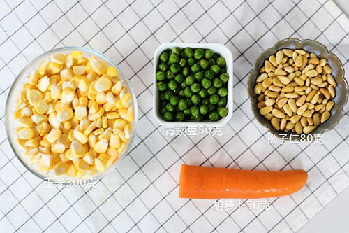 玉米300克,松子仁80克,胡萝卜50克,青豌豆50克;