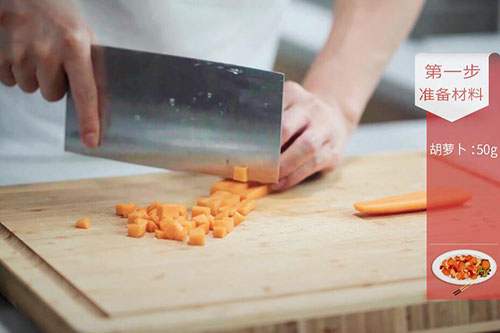 1.胡萝卜洗净切丁,青豌豆、玉米粒洗净待用;