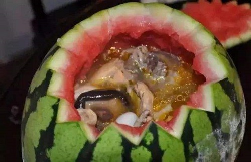 苏州西瓜鸡是苏州特色菜,西瓜和鸡肉的结合,口味很独特,外观看起来很京虎子,色香味俱全。苏州西瓜鸡将鸡的鲜味和水果的芬芳味混合在了一起,还加入了火腿,营养丰富,味美清香,汤清瓜香。