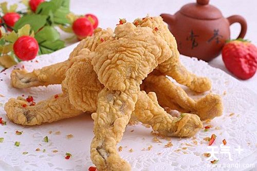 炸田鸡腿怎么做的呢?将活田鸡剁下,大腿扒去皮,剁去爪再从骨节处剁开,放盆内,加点佐料卤十分钟。国内放上油,田鸡蘸上面粉,一个一个地放入油内炸熟捞出控净油装盘即可。菜品外焦内嫩,味美鲜美,营养丰富,是一道孩子最喜欢的美食。