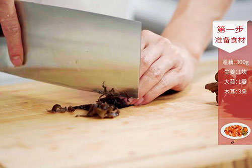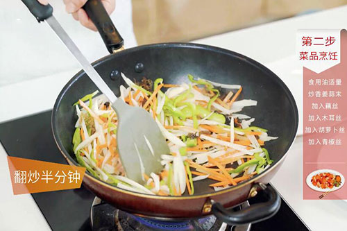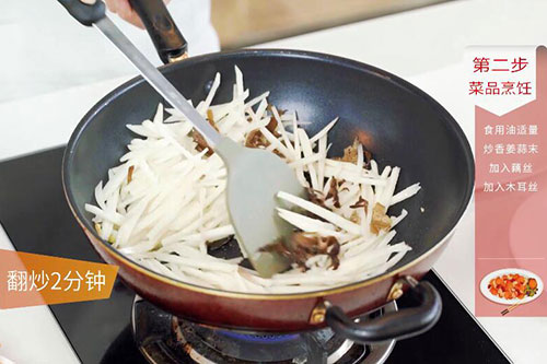 3.锅中放入适量油,清炒藕丝的做法 清炒藕丝怎么做好吃油温烧至7成热,放入姜蒜末炒香,放入藕丝、木耳丝翻炒2分钟;