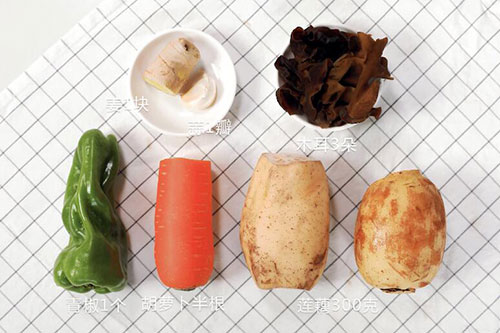 莲藕300克,胡萝卜半根,青椒1个,木耳3朵;